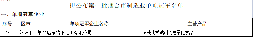 近日,煙臺(tái)市工業(yè)和信息局公示了評(píng)審?fù)ㄟ^(guò)的第一批制造業(yè)單項(xiàng)冠軍企業(yè)(產(chǎn)品)名單。煙臺(tái)遠(yuǎn)東精細(xì)化工有限公司光榮上榜,成為煙臺(tái)市制造業(yè)單項(xiàng)冠軍示范企業(yè)。